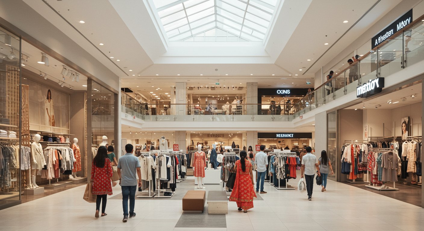 インドの近代的なショッピングモールでアパレルショップを訪れる消費者たち