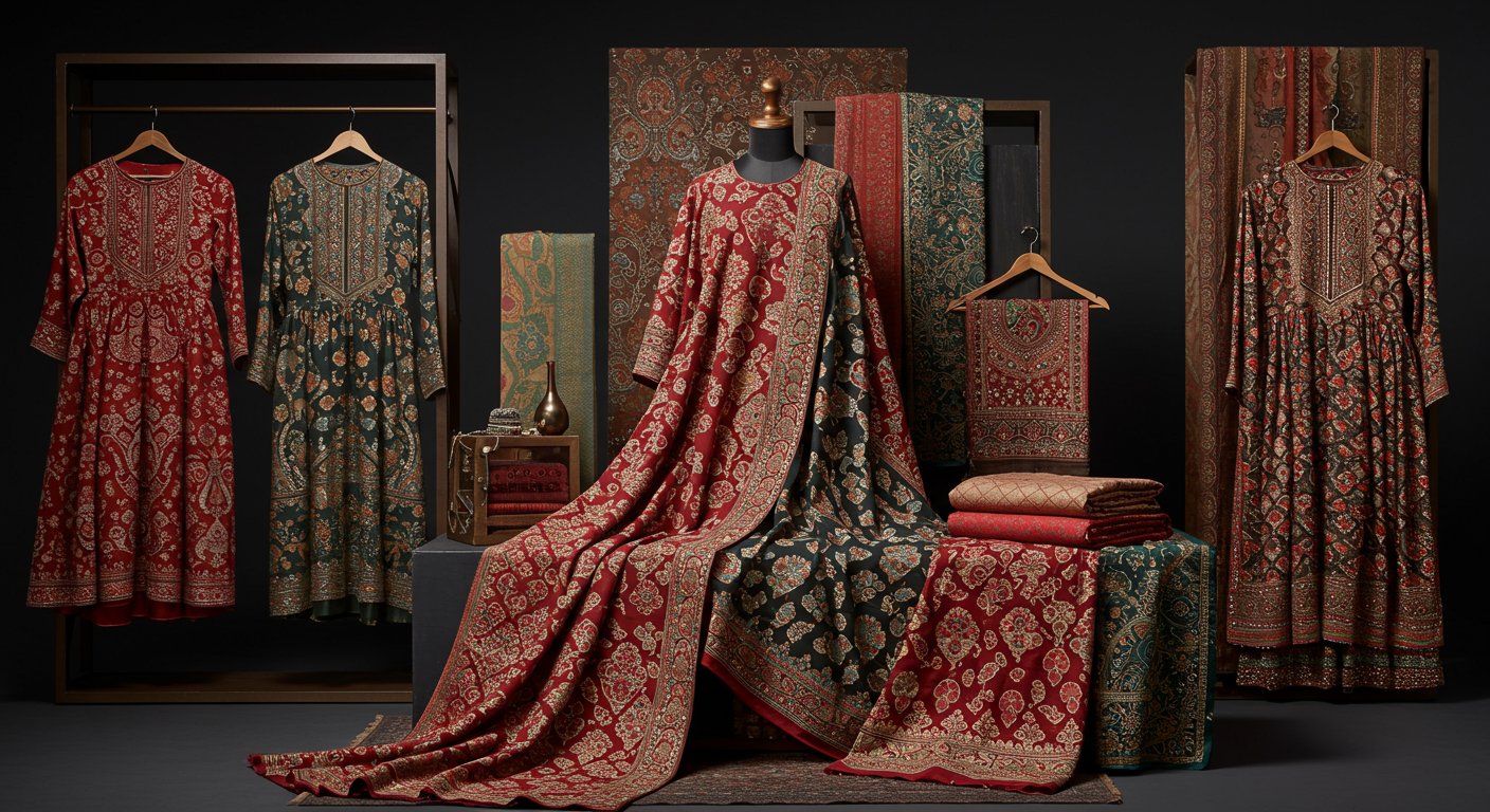 インドの伝統的な織物と現代的なデザインを融合したファッションディスプレイ