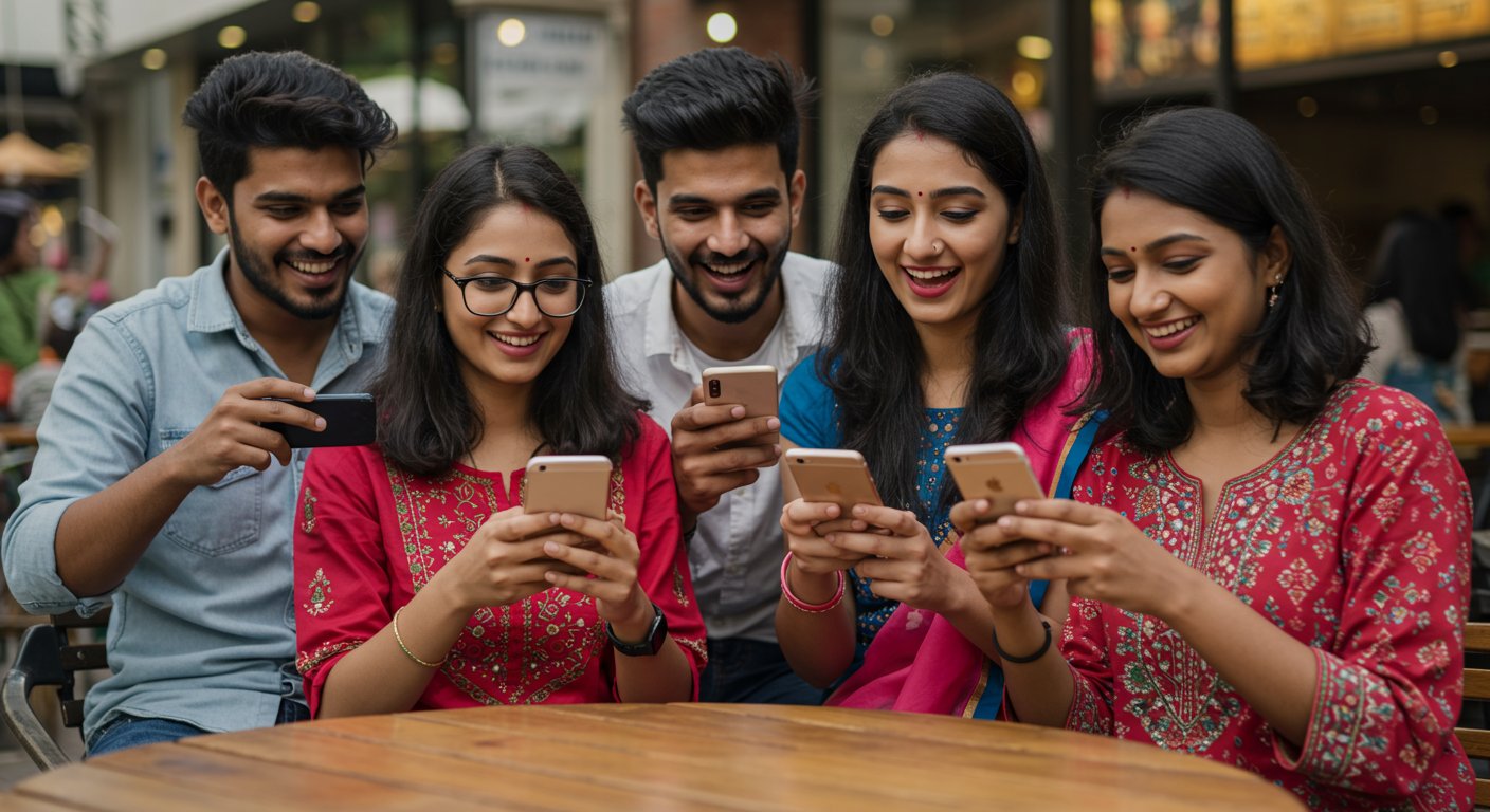 スマートフォンでファッションアプリを閲覧するインドの若者たち